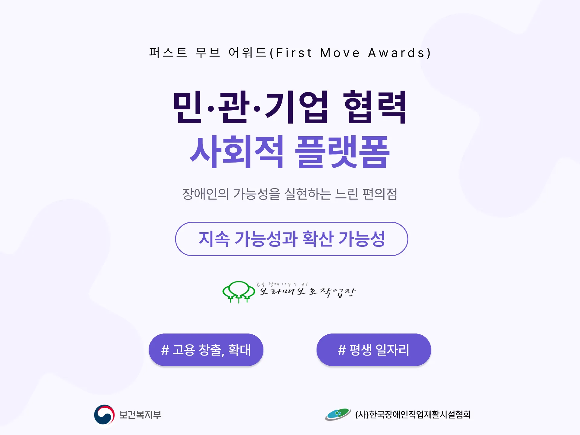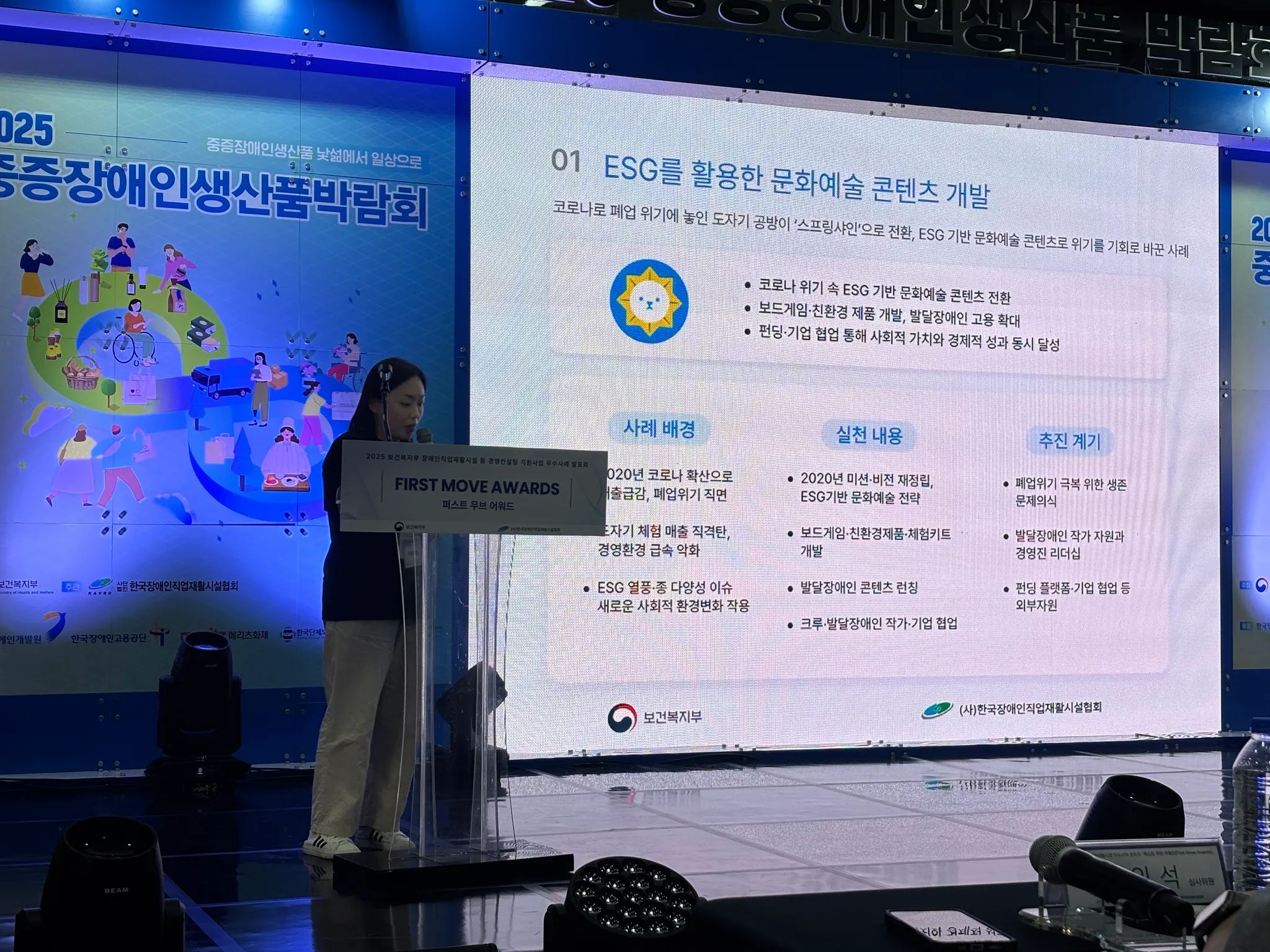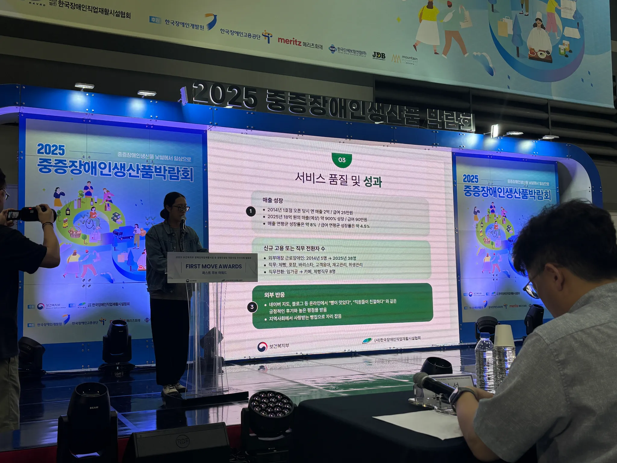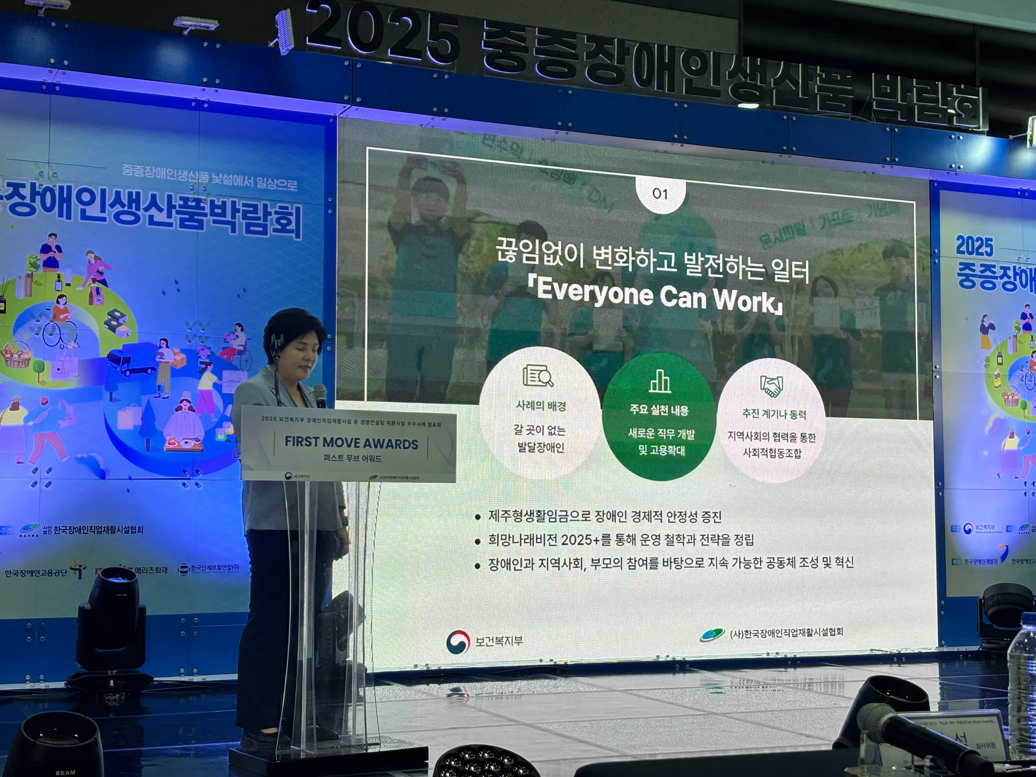 우수사례 발표 통해 표준화·콘텐츠화해 전국 확산 도모 품질·브랜딩·ESG를 묶어 경쟁력 향상 모색에 나서 [더인디고] 2025년 9월 9일부터 10일까지 양재동 aT센터 제2전시장에서 열린 장애인직업재활시설 우수사례 발표회 「퍼스트 무브 어워드(First Move Awards)」는 ‘중증장애인생산품, 낯섦에서 일상으로’를 화두로 성황리에 막을 내렸다. 단순 전시를 넘어 공공·민간 바이어가 직접 제품을 체험·구매하며 판로 확대를 모색한 이번 박람회는, 중증장애인생산품을 ‘특수한 소비재’가 아닌 보편적 생활재로 재정의하는